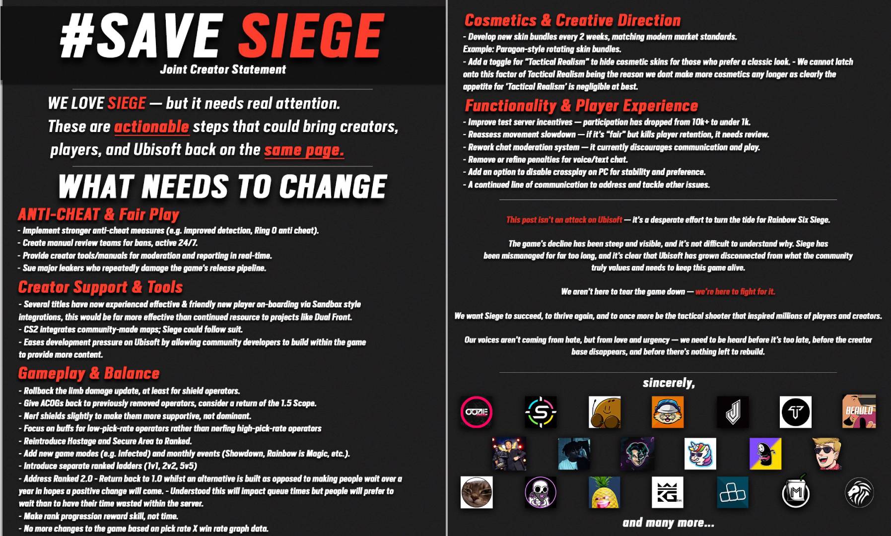 Right before the R6 Munich Major 2025, some prominent pro players published a document titled “Save Siege”. They listed their suggestions for improving the game, and anti-cheat measures were placed in the first section.