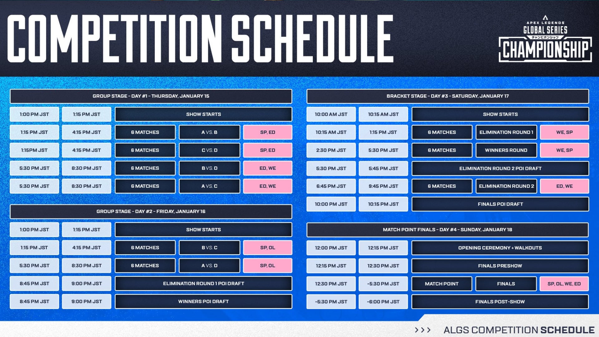 | Finals Stage | Teams must reach the 50-point threshold to become eligible for the Match Point Finals. The eligible teams must win an additional match to win the ALGS 2026 Championship. |