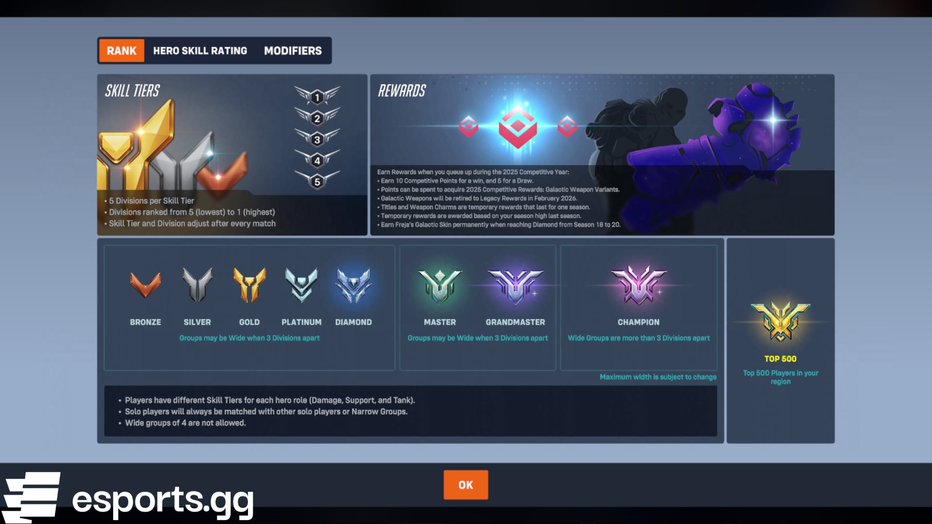 Overwatch 2 has eight skill tiers that come before the Top 500 one. These include Bronze, Silver, Gold, Platinum, Diamond, Master, Grandmaster, and Champion. Players between Bronze and Diamond can be in wide groups when they are three divisions apart. The same goes for the Master and Grandmaster ranks. Finally, the wide groups within the Champion rank are more than three divisions apart.