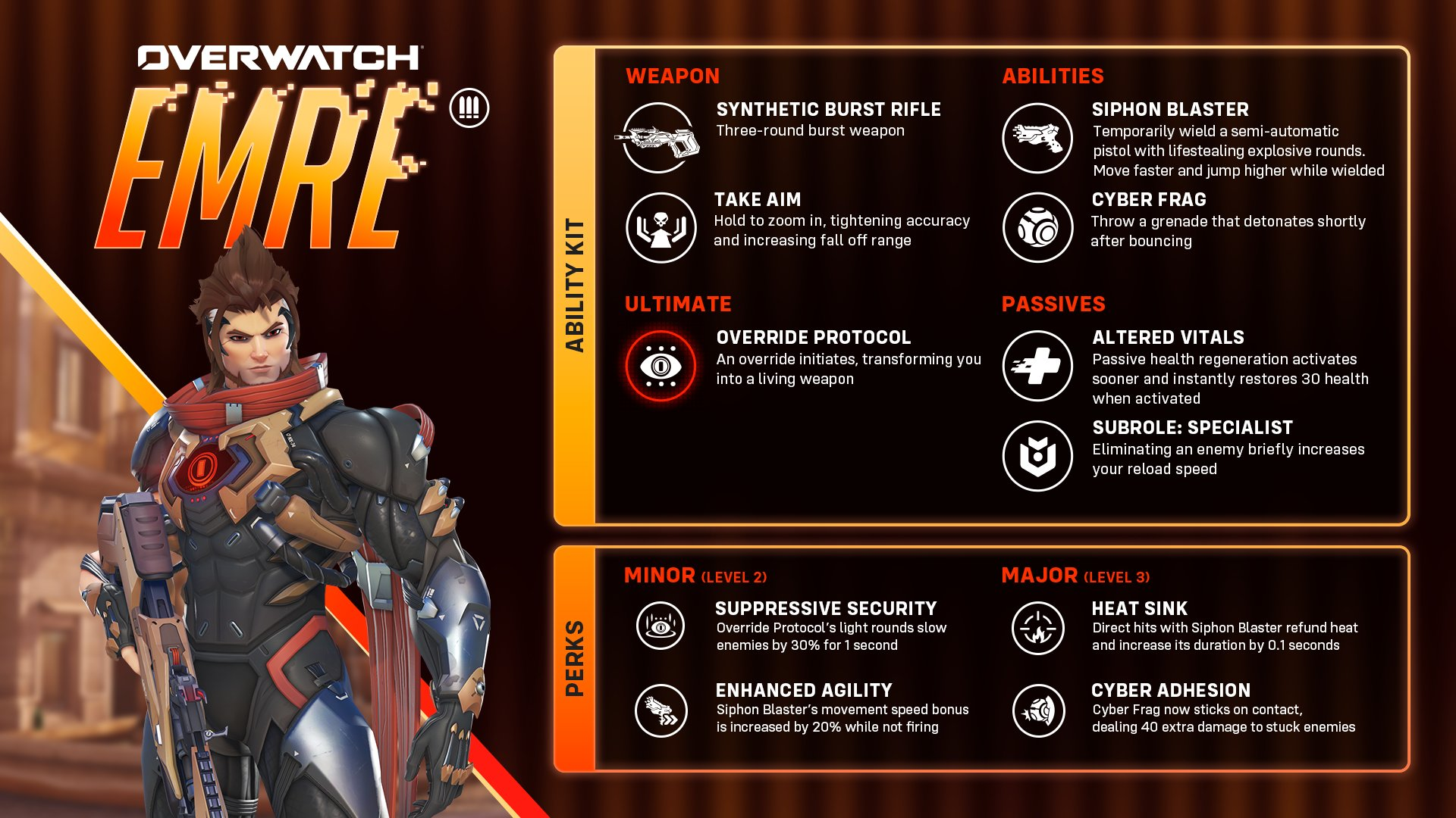 | Specialist | Eliminating an enemy briefly increases your reload speed. | Bastion, Emre, Junkrat, Mei, Soldier: 76, Symmetra, Torbjorn | |