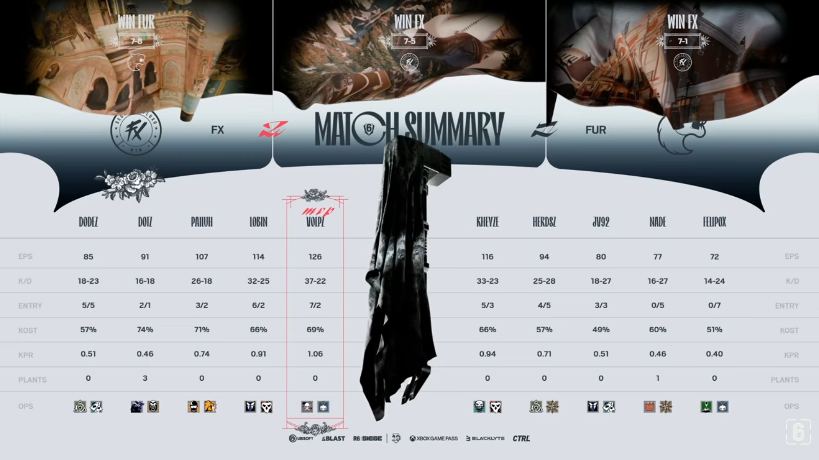 | 7:15 p.m. CET / 1:15 p.m. ET, Feb. 13 | Upper final | Team Falcons 1:1 FaZe 4:7 on Bank 7:5 on Border Lair |