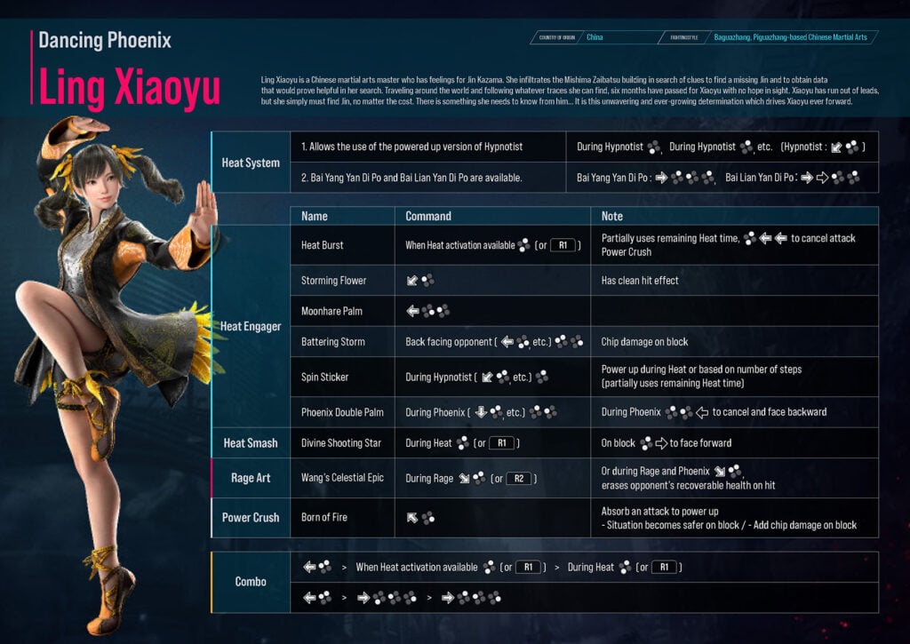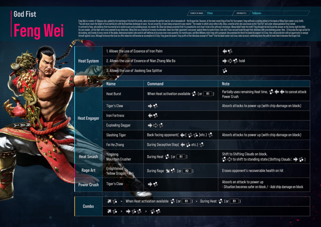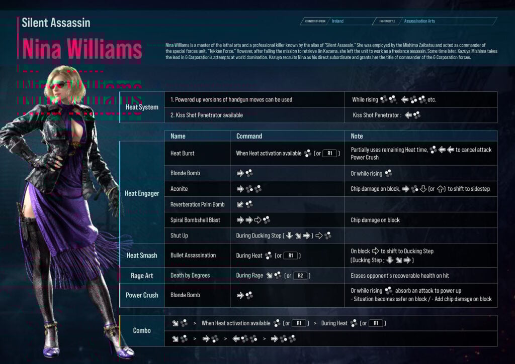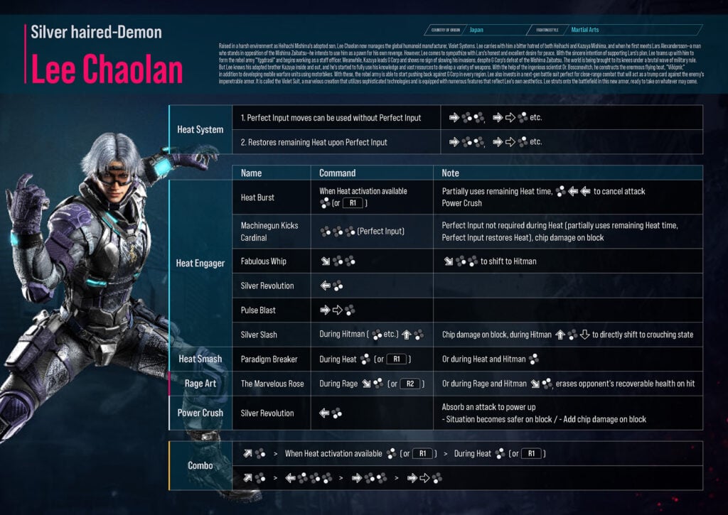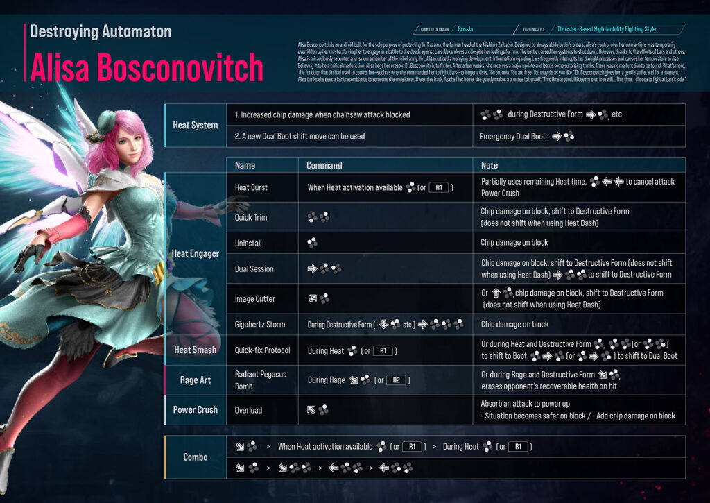 Finally, here is last set of moves for the game’s main roster. These are for Reina, Victor Chevalier, Devil Jin, Alisa Bosconovitch, Lee Chaolan, Zafina, Panda, and Feng Wei.