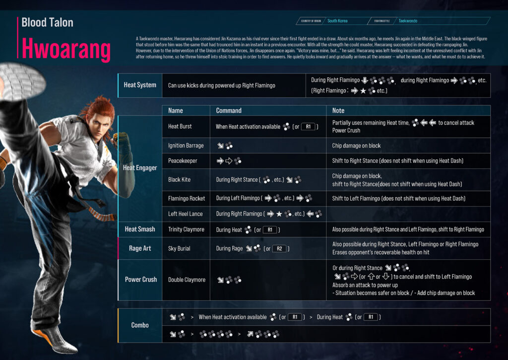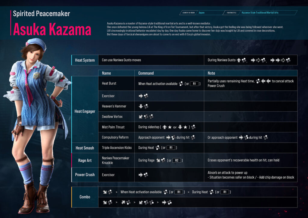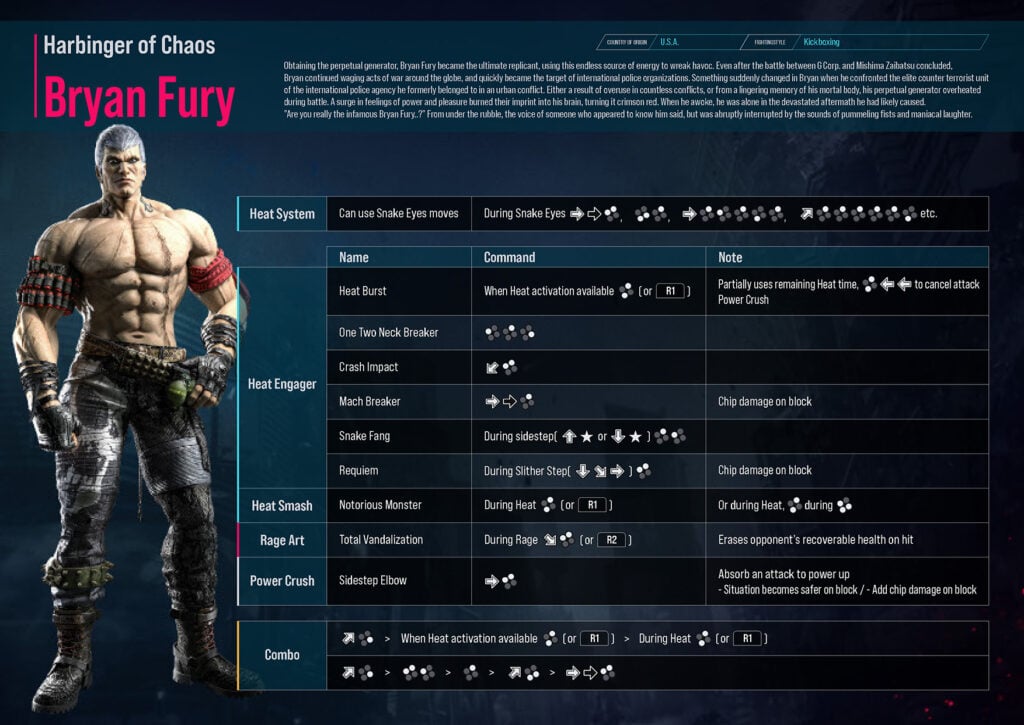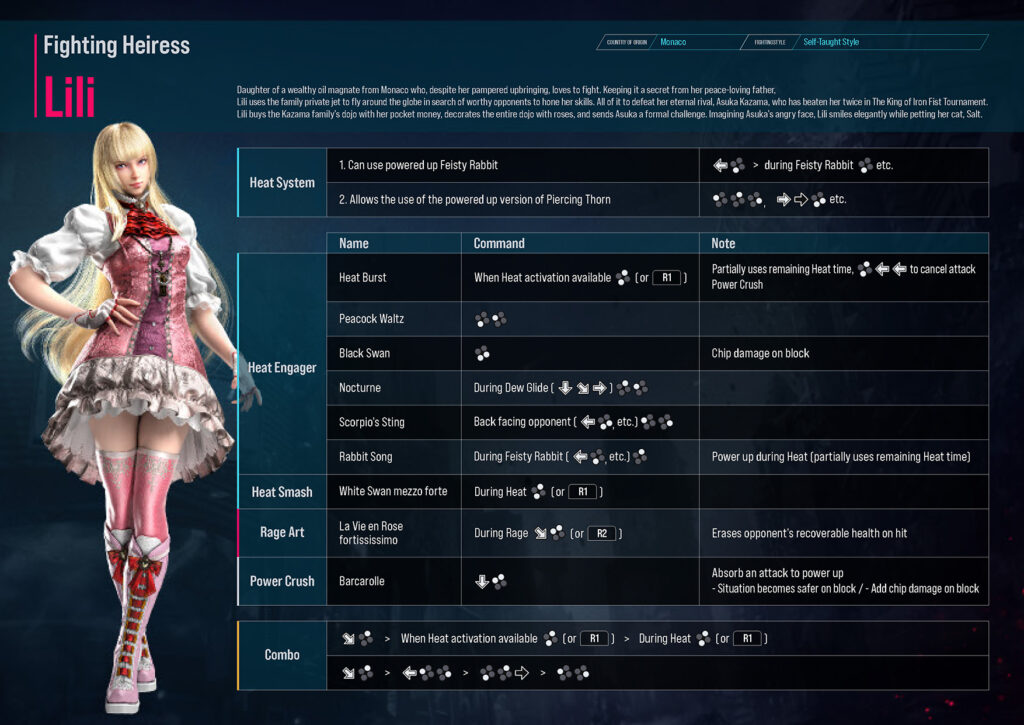 Here are more moves and combos. The ones below include the sets for Claudio, Serafino, Bryan Fury, Hwoarang, Lili, Leroy Smith, Asuka Kazama, Nina Williams, and Jack-8.
