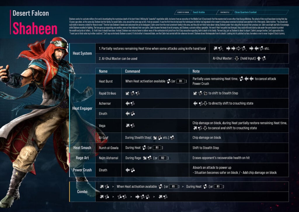 Next, here are the different moves for Kuma, Shaheen, Leo, Sergei Dragunov, Steve Fox, Yoshimitsu, Raven, and Azucena Ortiz.