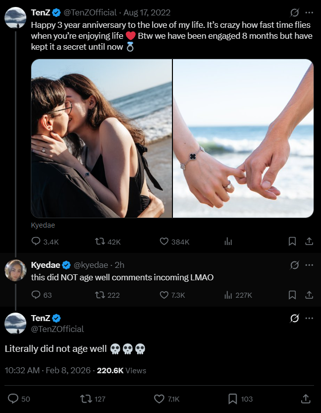 Despite the heavy air of their breakup post, TenZ and Kyedae did not miss the opportunity to poke fun at the situation. Both of them replied to their engagement post, with TenZ saying “Literally did not age well” followed by skull emojis.