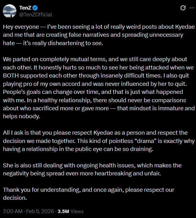 The two have not discussed their plans for their careers. Kyedae quit streaming indefinitely in early 2025, while TenZ streams regularly after his departure from Sentinels and retirement in 2024.